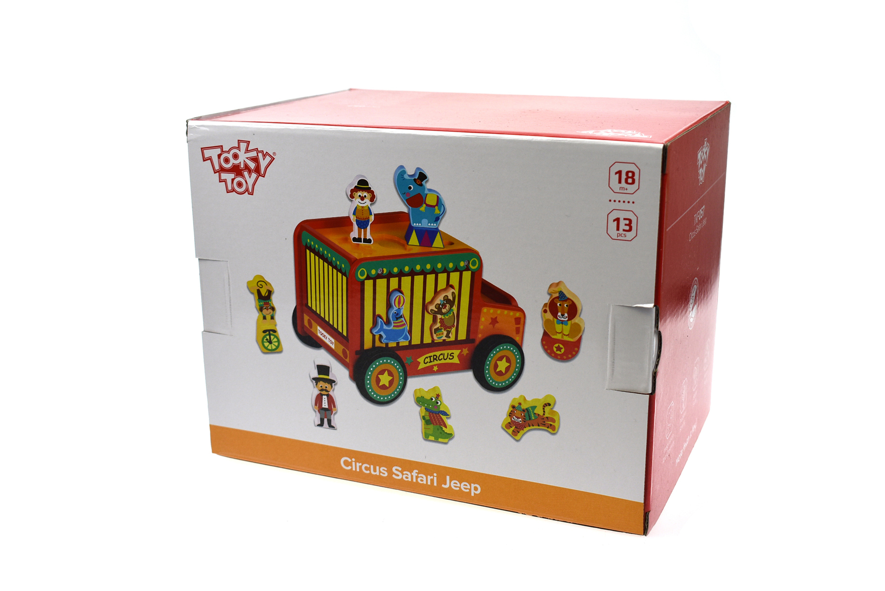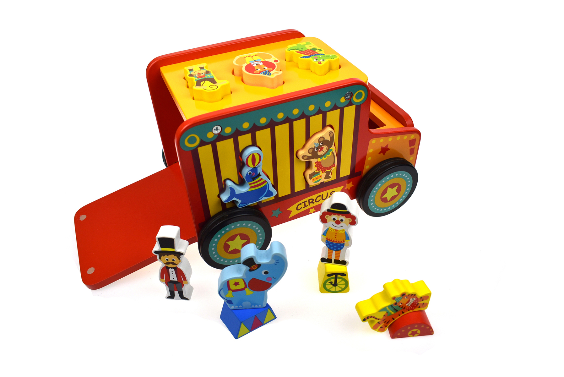 A bright and vibrant wooden Safari bus. Painted with bright non-toxic paint. Comes complete with circus animals and animal shaped windows. The animals can be push through the shape sorting bus. Promotes problem solving and coordination skills. Beautifully boxed.